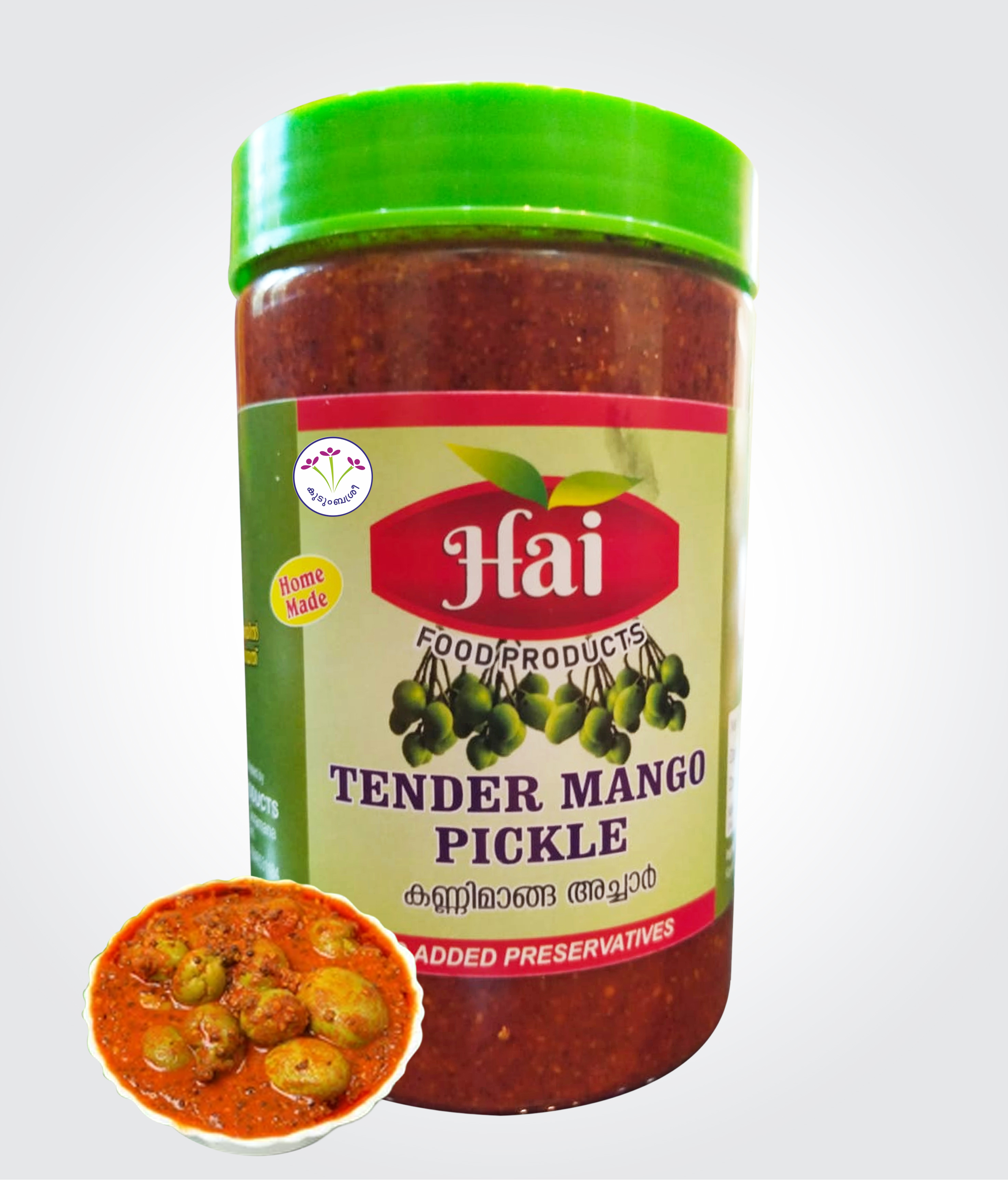 Traditional tender mangoes pickled in rich Kerala-style masala for an authentic taste.